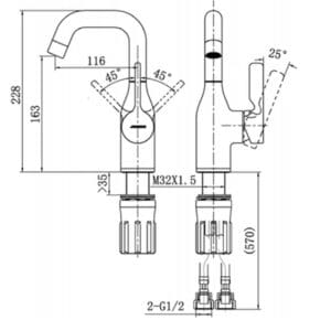 Slavina za umivaonik “Visina između izlaza i ulaza: 163 Udaljenost od središta izlaza vode do tijela: 116 Ukupna visina: 228 Preporučena veličina otvora: 34~37 ” “Materijali: plastika + metal ...