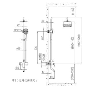 “Glava tuša: 200*200 Ručni tuš: 115*115 Udaljenost između centra ulaza: 150 Navoj: G1/2B Udaljenost od ulaza do postolja za montažu: 776 Udaljenost od ulaza do vrha: 950-1250 Udaljenost od ...